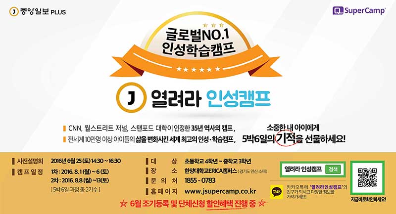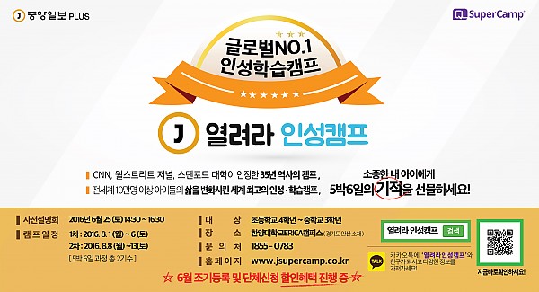 **이번 여름 슈퍼캠프는 중앙일보플러스와 함께 "열려라 인성 캠프" 이름으로 진행됩니다.